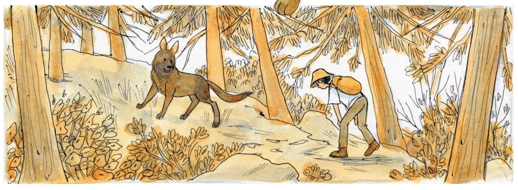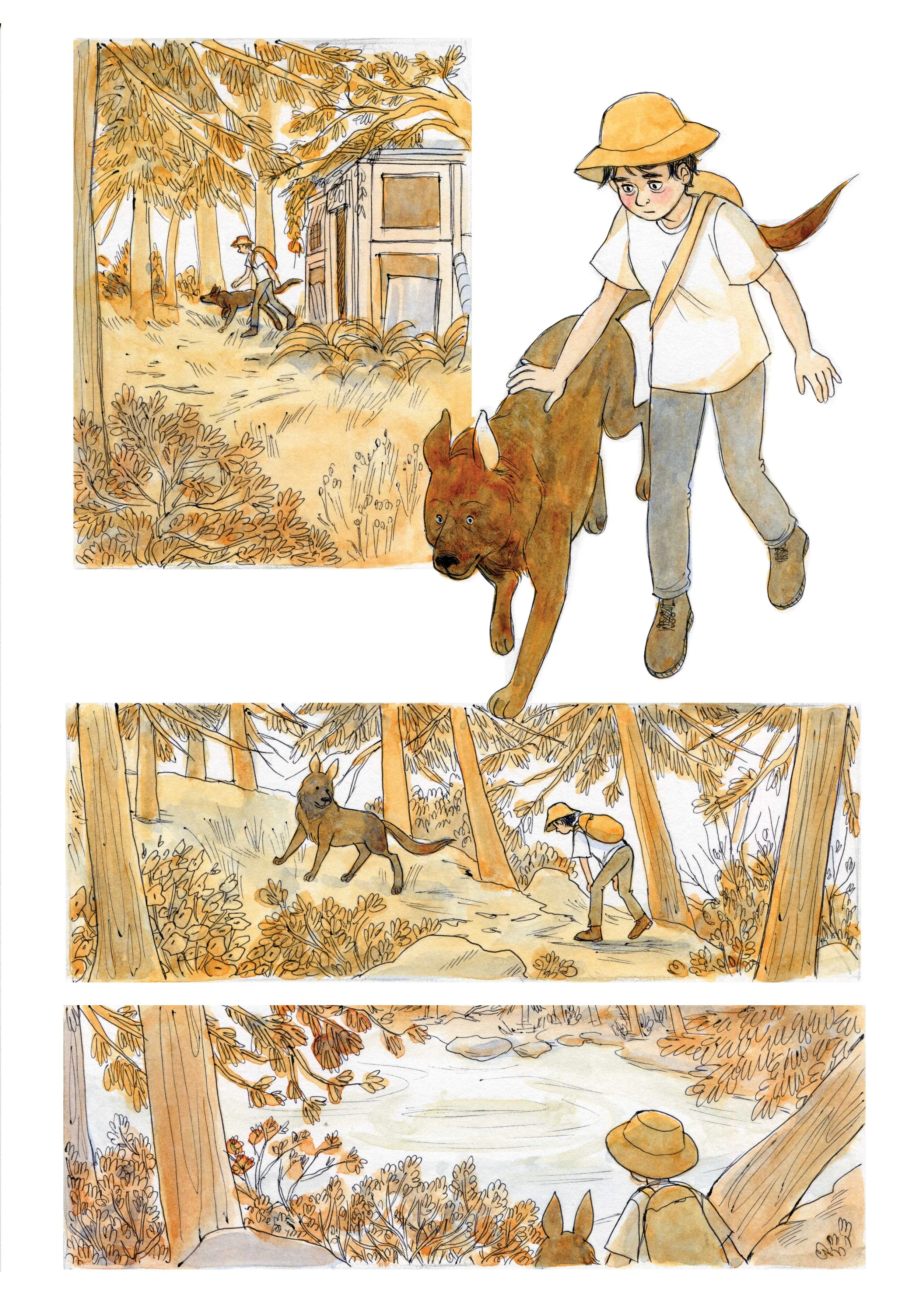 I actually pencil and ink all of my books traditionally, because that's how I've always done it, and I've never made the leap to doing it fully digitally. For the watercolor, I felt that it fit the mood and vibe of the book to be in traditional media. Ash’s Cabin really feels earthy and reality-based. I had actually done my first book, Koko Be Good, in watercolor, so I had that experience, but I didn't know what I was doing. I was painting watercolors on printer paper, so it looked terrible, at least it scanned terribly. But I was confident in what I was doing. It was so much easier to watercolor a book than to color digitally. With digital, I can keep changing colors, but with watercolor, you're more limited in a way, but because of that, you're free to move on. I was trying to work with a limited palette, so it went by really fast. You can just spread the water a little, and it covers more space, whereas digitally, I would keep adding more stuff or tinkering. I think the whole process was great because it saved me time, and it was calming to watercolor. I'm not sure if I'll do it for future books, but for this one, it was perfect.